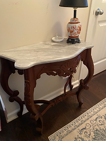 This is French Louis XV style carved entry table with a polished gray marble top. This is not an antique. Top marble piece is removable..